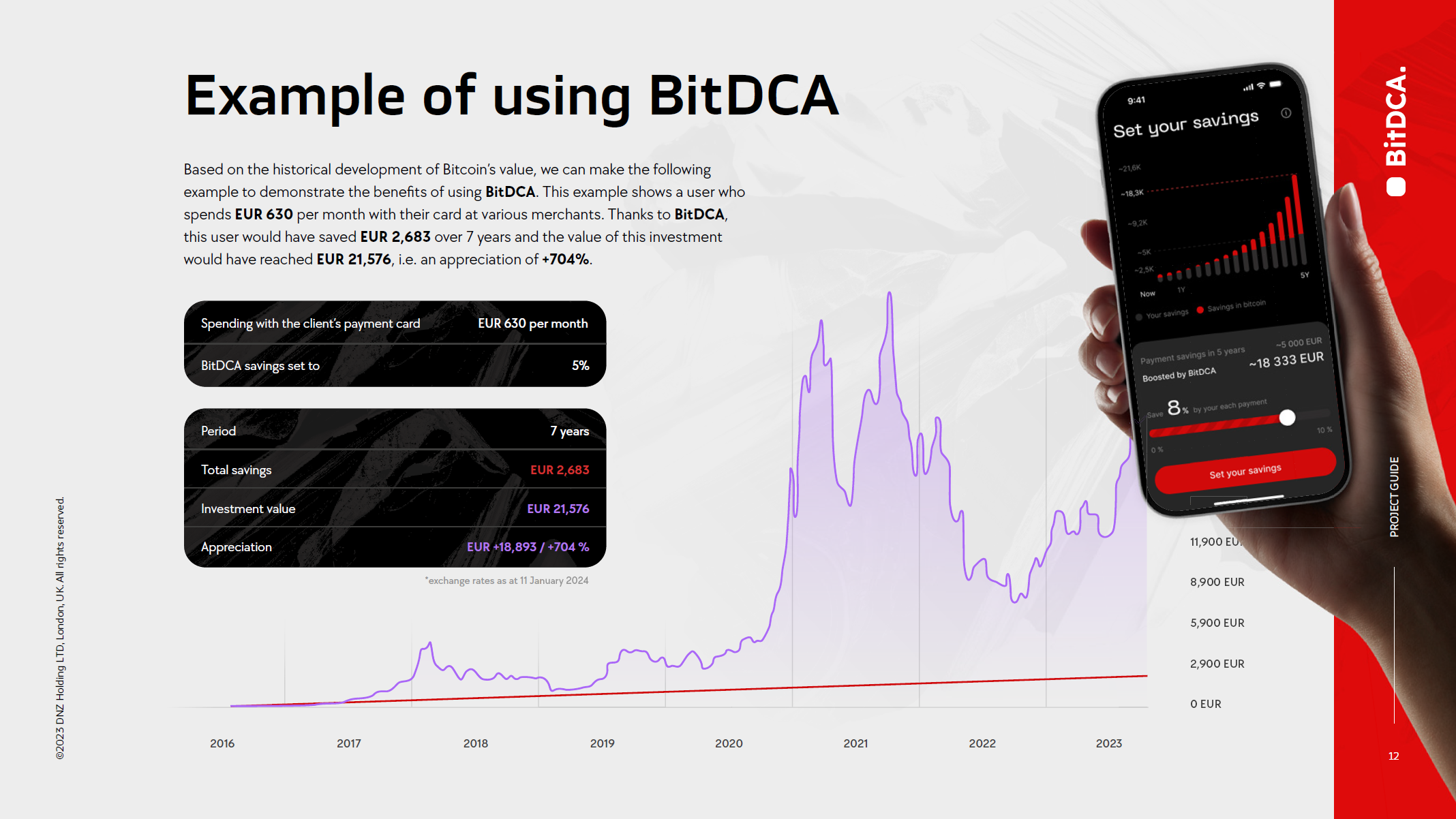 Based on the historical development of Bitcoin’s value, we can make the following example to demonstrate the benefits of using the BitDCA application. This example shows a user who spends $625 per month with his card at various merchants. Thanks to Littlebit, this user would have saved $2,994 over 8 years and the value of this investment would have reached $30,092. That is an appreciation of +905% in 8 years. (source)